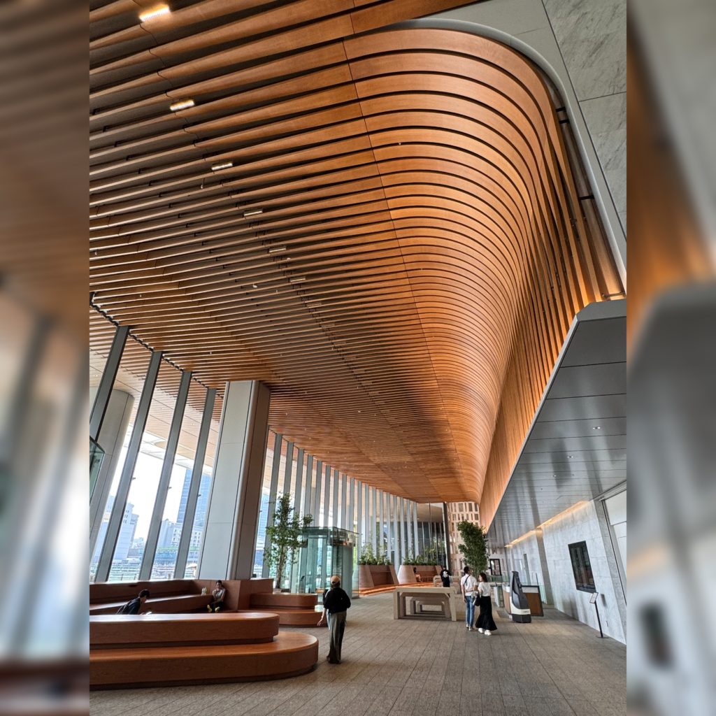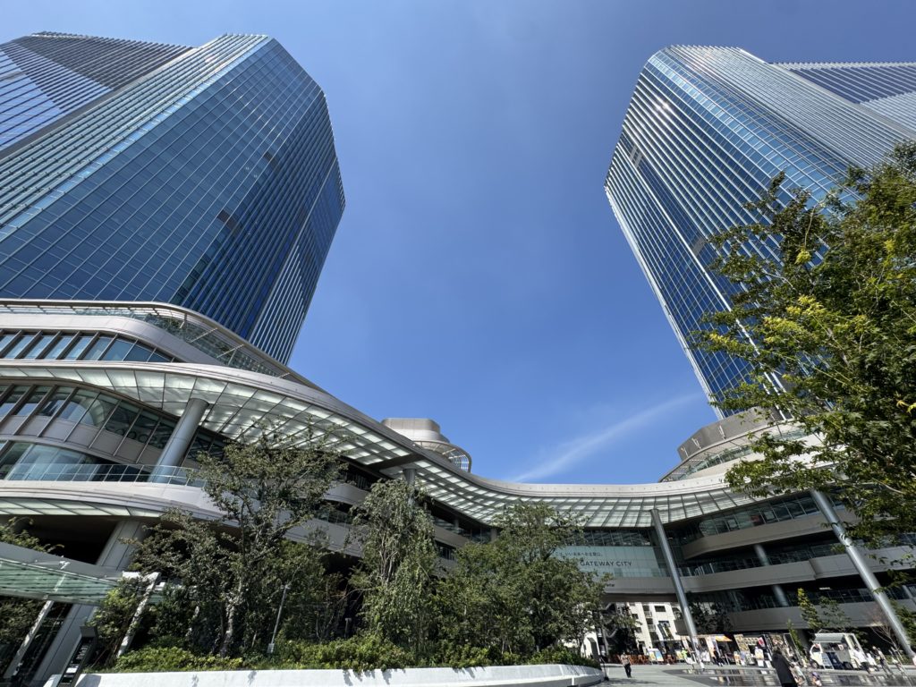 大規模再開発の中核施設としてつくられ、ゲートウェイという名を表すかのように、駅を出た正面の左右に門のように高層建築がそびえています。