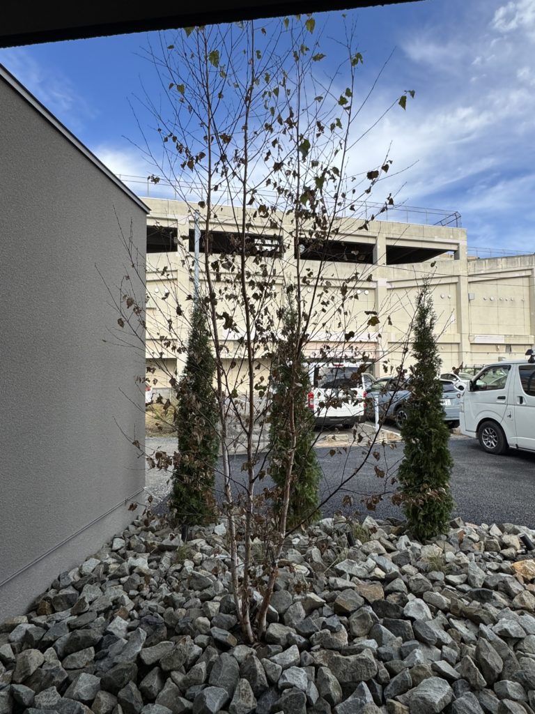 後ろの常緑樹が大きく育ち、その間に植えたグラスが穂を立てると、さらにシラカバが引き立つと思います。